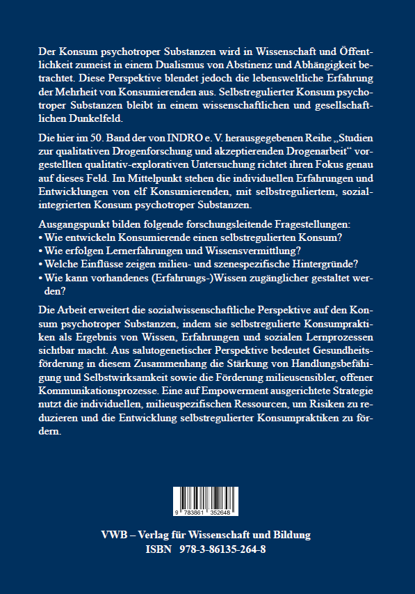 Der Konsum psychotroper Substanzen wird in Wissenschaft und Öffentlichkeit zumeist in einem Dualismus von Abstinenz und Abhängigkeit betrachtet. Diese Perspektive blendet jedoch die lebensweltliche Erfahrung der Mehrheit von Konsumierenden aus. Selbstregulierter Konsum psychotroper Substanzen bleibt in einem wissenschaftlichen und gesellschaftlichen Dunkelfeld.